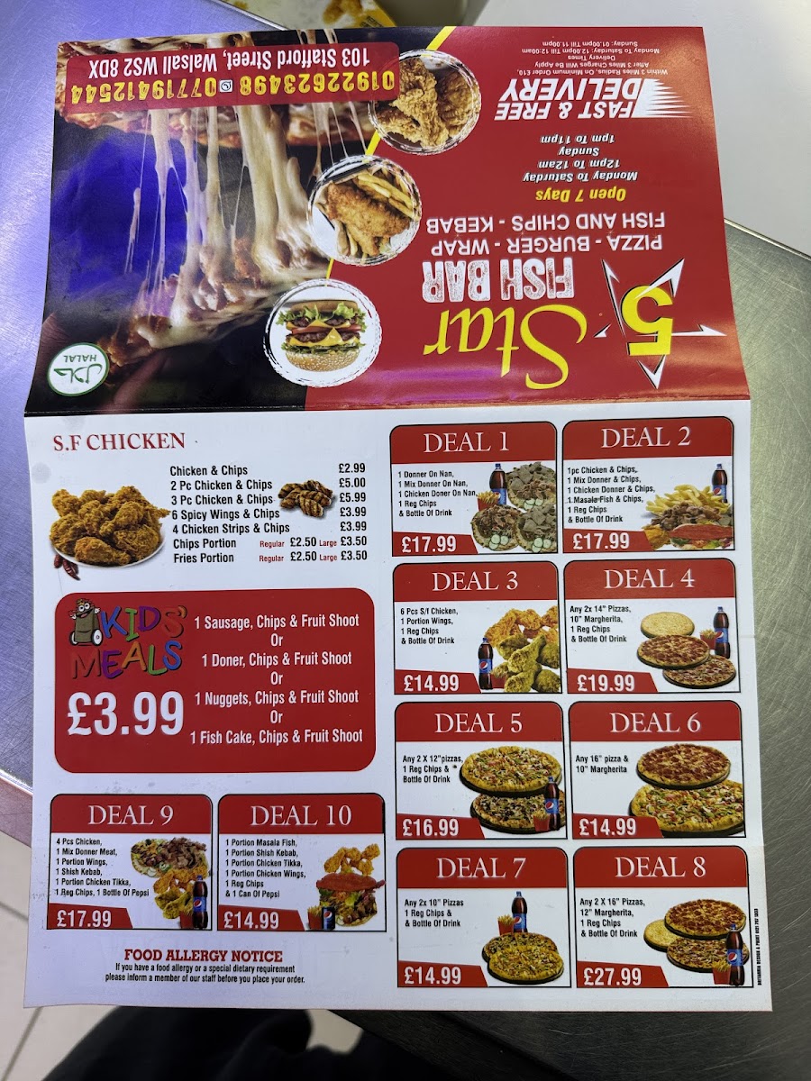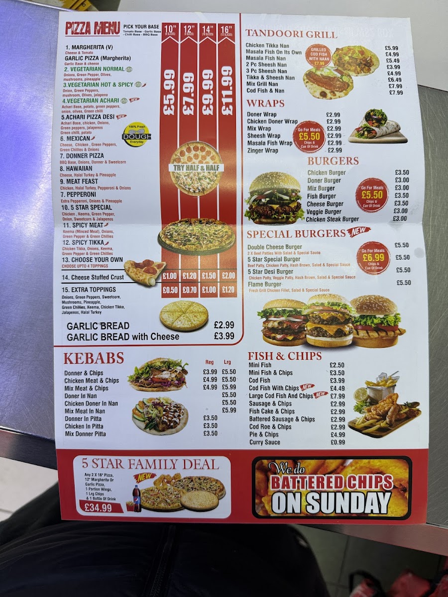 The menu at 5 Star Fish Bar in Walsall offers a range of tasty and satisfying options, perfect for any craving. Among the highlights are the classic Fish & Chips, a beloved dish that never fails to impress with its perfectly crispy batter and tender fish. For those seeking something with a bit more spice, the Peppers provide a flavorful, zesty option. If you're in the mood for a hearty, filling meal, the Doner Meat in Naan is a fantastic choice, packed with savory goodness. For pizza lovers, the Mexican Pizza offers a unique and flavorful twist on a traditional favorite. The Mixed Kebab is another standout, offering a delicious combination of tender meats and flavorful seasonings. If you're after something more substantial, the Doner Meat with Battered Chips is sure to satisfy, while the Mixed Doner Meat and Battered Chips provides an even more indulgent option. Each dish reflects the restaurant's commitment to quality and flavor, making it a great spot for a delicious meal.